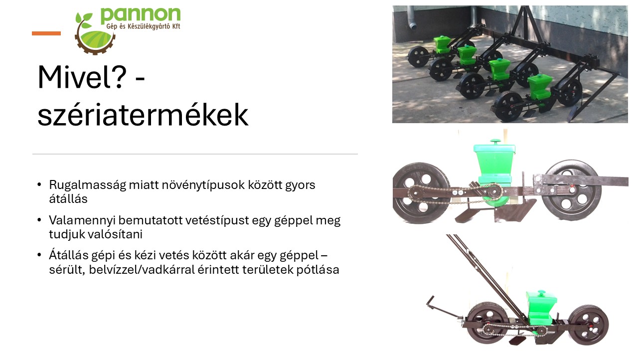 A Pannon Gép- és Készülékgyártó Kft. 30 éve gyárt szemenkénti vetőgépeket kis és közepes gazdaságok részére. Az alábbiakban az AgroMash25 kiállításon bemutatott előadásunk anyagát ismertetjük. Hogyan hasznosíthatóak vetőgépeink rugalmasan a gazdaság, időjárás, piac kihívásai közepette a minél eredményesebb gazdálkodás érdekében? Reméljük, ismertetőnkből választ kapnak ezekre a kérdésekre, amennyiben további kérdések merülnek fel, keressenek minket elérhetőségeinken!